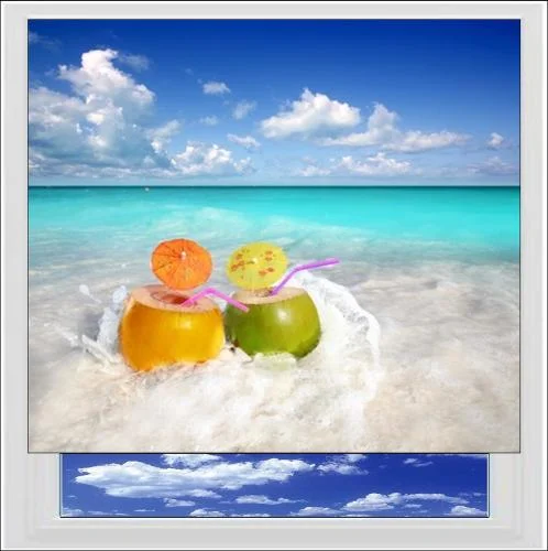 Cocktails On The Beach Digitally Printed Photo Roller Blind, relax in the bath with a coconut cocktail in the beautiful tropical beach waters of the Caribbean…bliss. Available in a standard fabric or a PVC fabric which is blackout and waterproof, ideal for bedrooms and bathrooms.