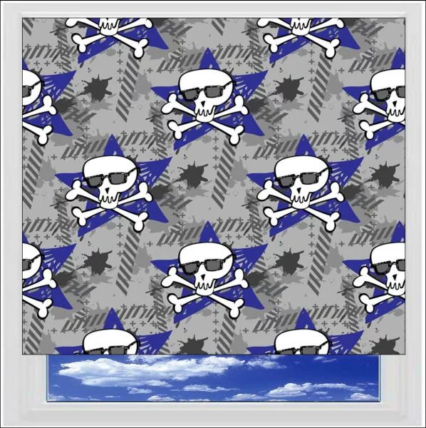 Cool Skulls Digitally Printed Photo Roller Blind has cool skulls wearing sunglasses in front of a blue star on a patterned grey background. Available in a standard fabric or a PVC fabric which is blackout and waterproof, ideal for bedrooms and bathrooms.
