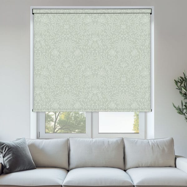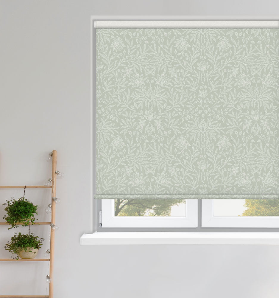 Florence Topiary Blackout Roller Blind has a white floral pattern on a green background. Recently, there has been a resurgence of interest in modern interpretations of William Morris-inspired fabrics. This trend blends traditional patterns with contemporary styles, offering a unique way to incorporate historic design elements into modern interiors. ‘Florence’ has embraced this trend to the max with its Morris inspired floral damask, softened with simple forms and textures and offered in a range of fresh contemporary hues.