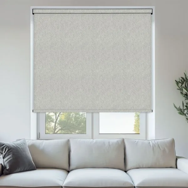 Herringbone Stone Blackout Roller Blind has a grey and white stitched pattern. The herringbone pattern has gained considerable popularity in interior design due to its distinctive and timeless appeal. This gorgeous, large-scaled creation is a modern take on this theme. The tactile weave with its sophisticated silvered grey hue and blackout finish, will add a cosy ambience to any room, traditional or modern, harmonising well with different colour schemes and design elements.