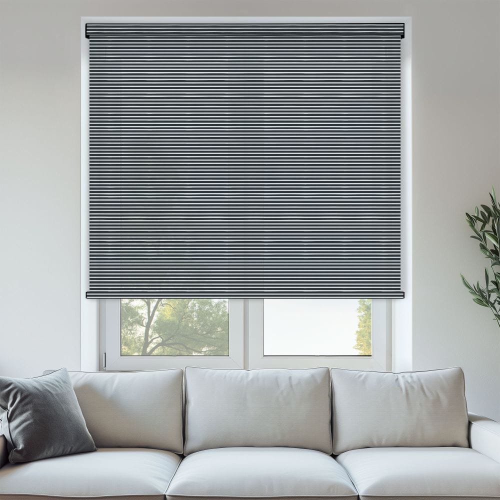 Java Anthracite Sheer Roller Blind has a striped sheer pattern in black. A striking horizontal striped sheer that will add a contemporary touch to any interior. Offering a balance between privacy and view, Java is sure to be a firm favourite as the variation in the stripe opacity adds depth and visual interest, enhancing the fabric’s ability to play with light.