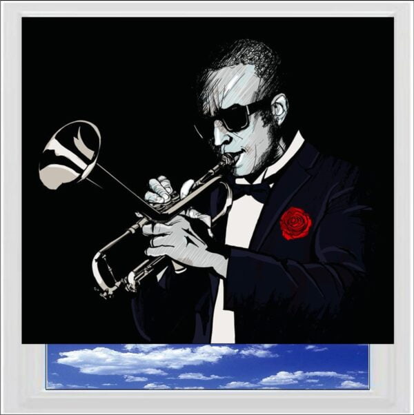Jazz Music Digitally Printed Photo Roller Blind a stunning drawn image of a jazz trumpet player wearing a single red rose. Available in a standard fabric or a PVC fabric which is blackout and waterproof, ideal for bedrooms and bathrooms.