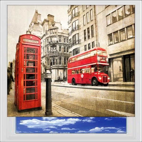 London Bus and Phone Box Digitally Printed Photo Roller Blind is a vintage sepia image of a red London bus and red telephone box. The London bus is slightly blurry as it is in motion and the vintage style creates stunning effect. Available in a standard fabric or a PVC fabric which is blackout and waterproof, ideal for bedrooms and bathrooms.