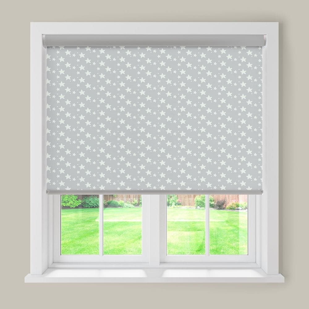Magical Grey Blackout Roller Blind has white stars on a grey background. Twinkle twinkle little star, as the blinds are drawn, the stars come out to create a magical starry room. These blinds will bring the night sky indoors, creating a peaceful feeling for a restful night’s sleep.