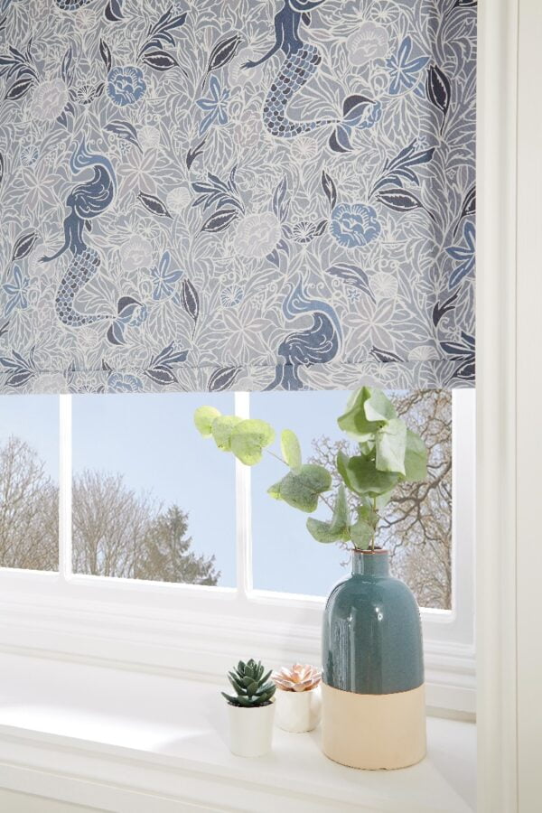 Mermaids of Mayflower Indigo Blackout Roller Blind has mermaids and flowers in blue and lilac. Imagination and beauty can be seen in this mythical mermaid print. In oceanic blues this sophisticated and whimsical print would be a stunning addition to a little one’s room or a bathroom!