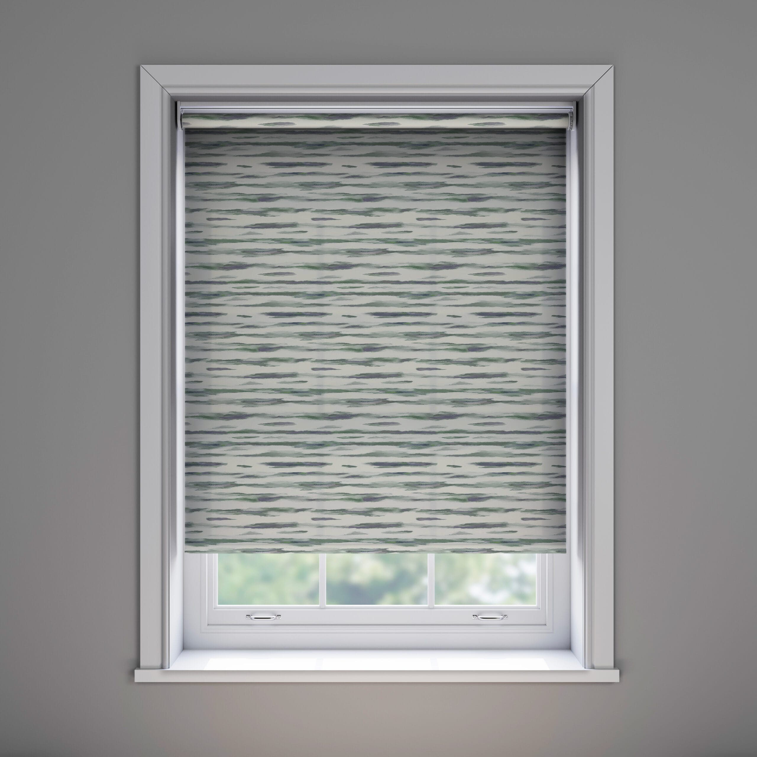 Miro Modesto Roller Blind has a green and grey pattern on white background.  A waterly horizontal portrays a soft zen like design.  Soft undulating tones and colours blend seamlessly through this modern hand painted design.