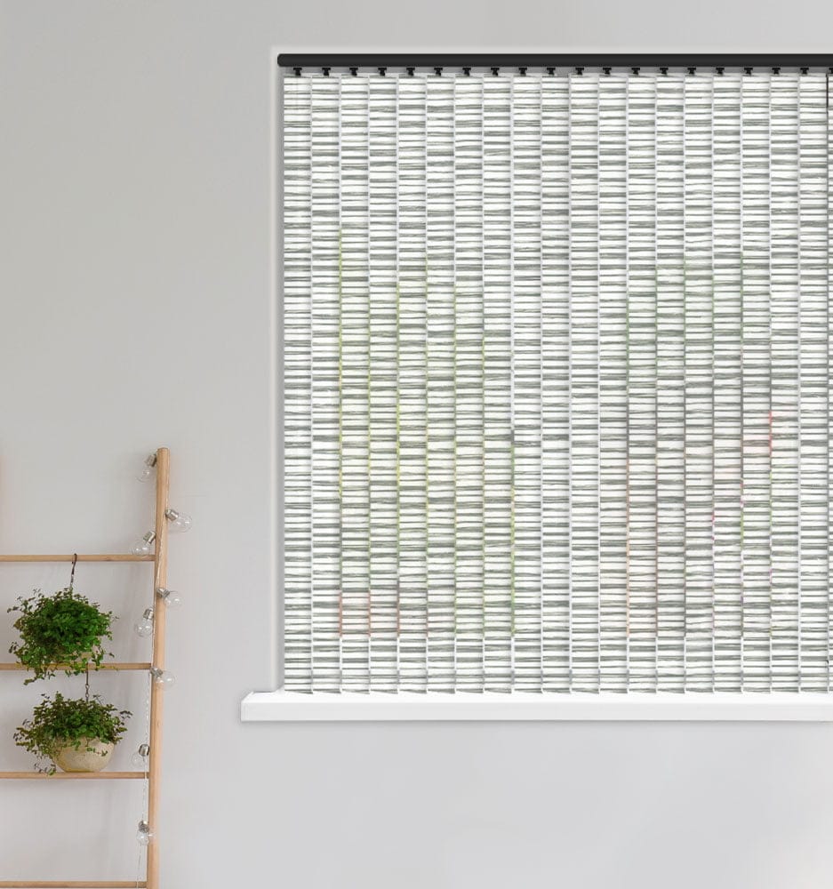 Monterey Shale sheer vertical blind has a sheer textured pattern in grey and white. This beautiful sheer fabric has a minimal design, trendy texture, while offering a hint privacy. Monterey is ideal for modern or contemporary settings where a combination of light control and stylish design is desired. Its semi-translucent nature allows it to soften the light in a room while the bold stripe pattern adds a touch of sophistication and elegance.