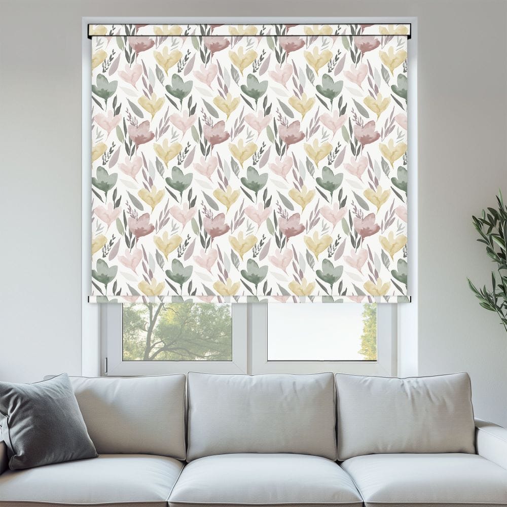 Ophelia Zephyr Roller Blind has plum, yellow, green and grey flowers and foliage on a white background. A contemporary take on a watercolour floral, Ophelia is a striking design which will transform any room within the home. This design and colour palette seamlessly blends into a variety of interior design styles, from modern and minimalist to rustic and vintage so has become a firm favourite in the collection.