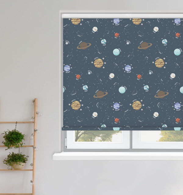 Planetarium Cosmos Blackout Roller Blind has named stars and planets on blue background. Calling all stargazers, delve into the depths of Planetarium’s deep inky blues, wondrous reds and silvery moons, this cosmos design will have you seeing stars. Stars and planets are an enduring choice for decorating kids’ bedrooms, as they resonate with both children’s natural interests and parents’ desire for a room that is both imaginative and versatile. Making learning fun, this design has been a hit!