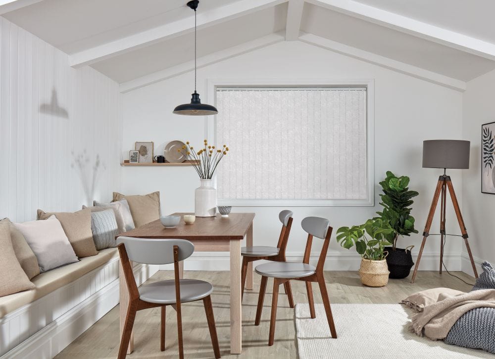 Romany White PVC Vertical Blind has a shiny brush stroke pattern that glistens when it catches the light in white. Adds subtle pattern without being too plain, a practical must have that brings beautiful delicate textures into a room. Please note this fabric is plain on the back.