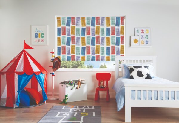 Times Table Multi Blackout Roller Blind has 1 – 10 times tables in red, blue, green, orange and purple on a squared white background. A simple design in bright colourful hues, this super helpful Educational kids print is a fun and alternative way for kids to learn their Times Tables.