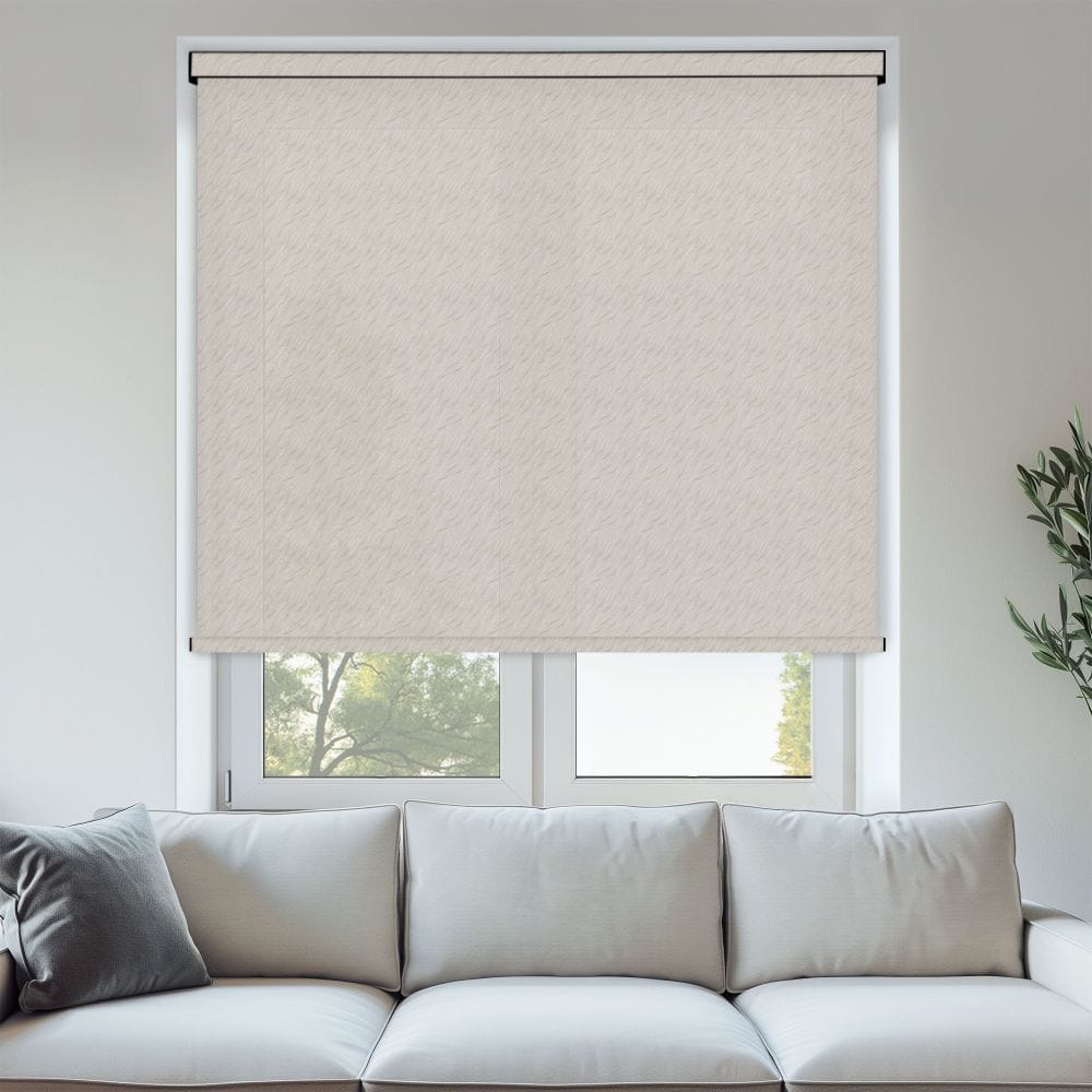 Zephyr Linen Eco Roller Blind has a stitched textured pattern in beige. A light filtering jacquard with a classic diagonal wisp motif. The textured pattern will interact subtly with light, creating soft shadows and highlights that enhance the visual interest of the fabric without needing anything more elaborate.